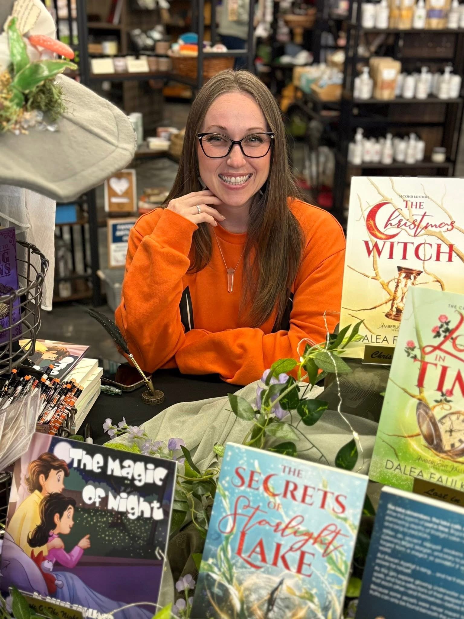 Dalea smiling, surrounded by books.